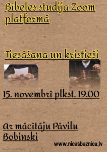 15. novembrī plkst. 19.00 Zoom platformā apskatīsim bieži piesaukto tiesāšanu kristiešu vidū un kur atrast veselīgu robežu. https://us04web.zoom.us/j/78838654444?pwd=4okUe4sWwFE4vrwvaKKlRDuLw6QqNz.1 Parole: c7HG0Y