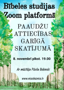 8. novembrī plkst. 19.00 aicinām uz Bībeles studiju Zoom platformā, kur apskatīsim tēmu par starppaudžu attiecībām garīgā skatījumā. https://us04web.zoom.us/j/75855617597?pwd=0qmp13qGvTwq02azbhFsEBoq6npTNc.1 Parole: 008Xv6