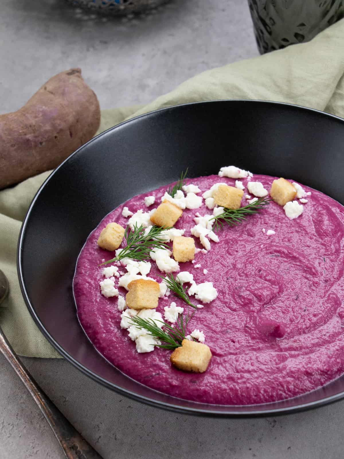 - Violeto kartupeļu pikantā zupa. Sastāvdaļas: Violetie saldie kartupeļi, sarkanais sīpols, ķiploks, ingvera pulveris, koriandrs, kurkuma, paprikas pulveris, Kajenas pipari, mandeļu vai kokosriekstu piens, olīveļļa apcepšanai un zaļumi. Pagatavošana: Novāra violetos kartupeļus, apcep sarkano sīpolu ar ķiplokiem un garšvielām. Sablenderē visas sastāvdaļas, pakāpeniski pievienojot kokosriekstu pienu. Pēc garšas apkaisa ar zaļumiem.