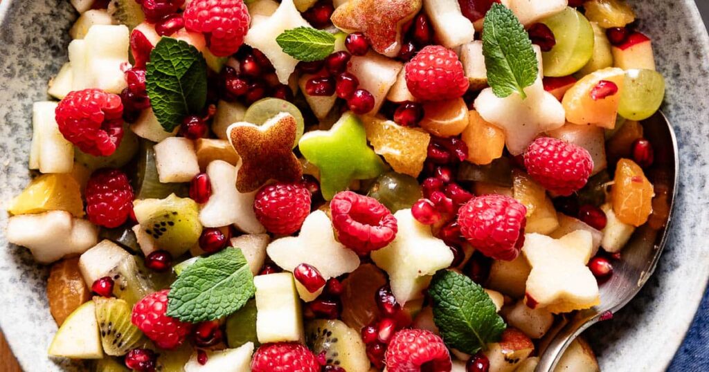 - Augļu salāti Ziemassvētku noskaņā. Sastāvdaļas mērcei: kļavu sīrups, kanēlis, muskatrieksts, vaniļas ekstrakts, citronu sula un miziņa. Kokosriekstu skaidiņas apkaisīšanai. Augļi: avenes, granātābolu sēkliņas, āboli, bumbieri, vīnogas, apelsīns, mandarīns, kivi. Pagatavošana: augļus sagriež mazos gabaliņos, sagatavo mērci ar garšvielām un visam ļauj ievilkties ledusskapī.