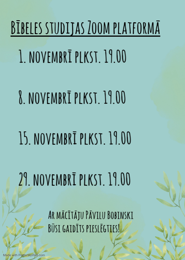 Novembrī ik sestdienu aicinām pieslēgties uz 40 min. Bībeles studiju Zoom platformā. Katrai reizei pieteikšanās links un tēma tiks izziņota atsevišķi. Esi gaidīts pieslēgties!