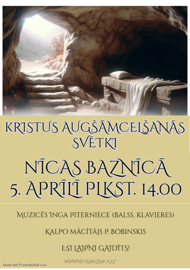 5. aprīlī plkst. 14.00 aicinām uz Lieldienu dievkalpojumu Nīcas ev. lut. dievnamā. Kalpo mācītājs P. Bobinskis, muzicēs I. Piterniece (balss, klavieres).