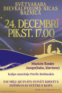 Kristus dzimšanas svētku dievkalpojums Nīcas baznīcā notiks 24. decembrī plkst. 17.00. Dievkalpojumā muzicēs Renārs Juzups (balss, klavieres), mācītājs Pāvils Bobinskis. Esi mīļi aicināts priecīgi svinēt Kristus dzimšanas svētkus ar mums!