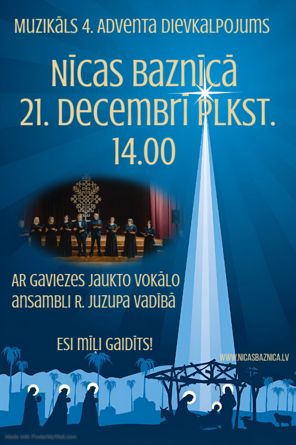 Pēdējā Adventa svētdienā aicinām uz muzikālo dievkalpojumu, kurā ar muzikāliem priekšnesumiem priecēs Gaviezes jauktais vokālais ansamblis R. Juzupa vadībā. Kalpo mācītājs Pāvils Bobinskis.